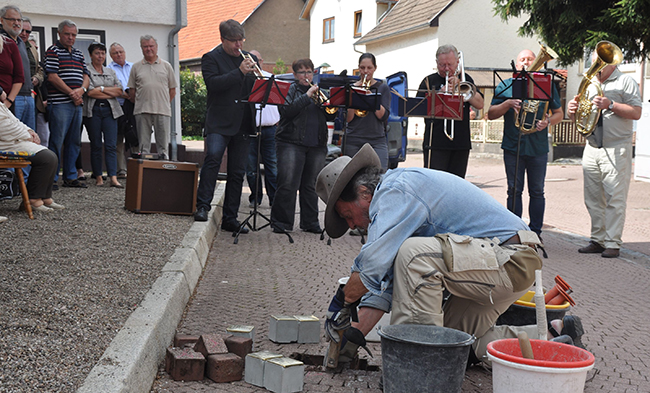 Herr Deming verlegt unter Beteiligung interessierter Bürger die Gedenksteine am Unteren Graben.