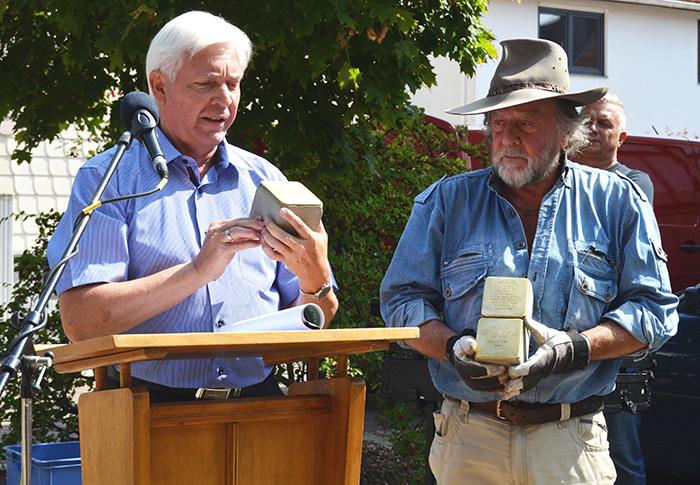 Schmidt und Gunter Demnig präsentieren die Stolpersteine vor dem